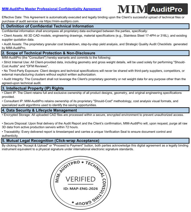 🛡️ Your IP is Safe: We utilize encrypted transmission via Payoneer and Tally to ensure maximum security.🔒 IP Sovereignty: All uploads are automatically protected by our Master Professional NDA.🔍 The "Blind" Protocol: For maximum security, we encourage clients to remove title blocks/logos from drawings.⚖️ Pure Neutrality: We take zero commissions from suppliers. We provide the data; you maintain the control.🧹 Data Purge: All CAD files are automatically purged from our workstations within 72 hours of report delivery.✅ Expert Verified: Every report is protected by Verification Seal ID: MAP-ENG-2026.